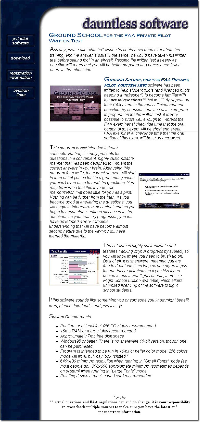 But soon enough, there was an actual home page featuring some software that we had originally written to help a few pilots we knew study for their written tests. Back then, it was Private Pilot - Airplane only! Interesting note: because back then it took some processing power to view a .jpg image, most of the graphics on the early homepage were .gifs!